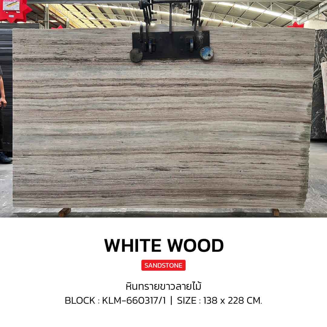 หินทราย ขาวลายไม้ (White Wood Sandstone) มีลักษณะคล้ายคลึงกับหินอ่อนซุปเปอร์เจนติเกรย์ด้วยเส้นแร่ลายไม้ แต่แตกต่างกันด้วยโทนสีเอิร์ธโทน และเนื้อหินสีน้ำตาลอันเด่นชัด เหมาะสำหรับการตกแต่งเพื่อเพิ่มความอบอุ่น หรือเพื่อให้ความรู้สึกความเงียบสงบ