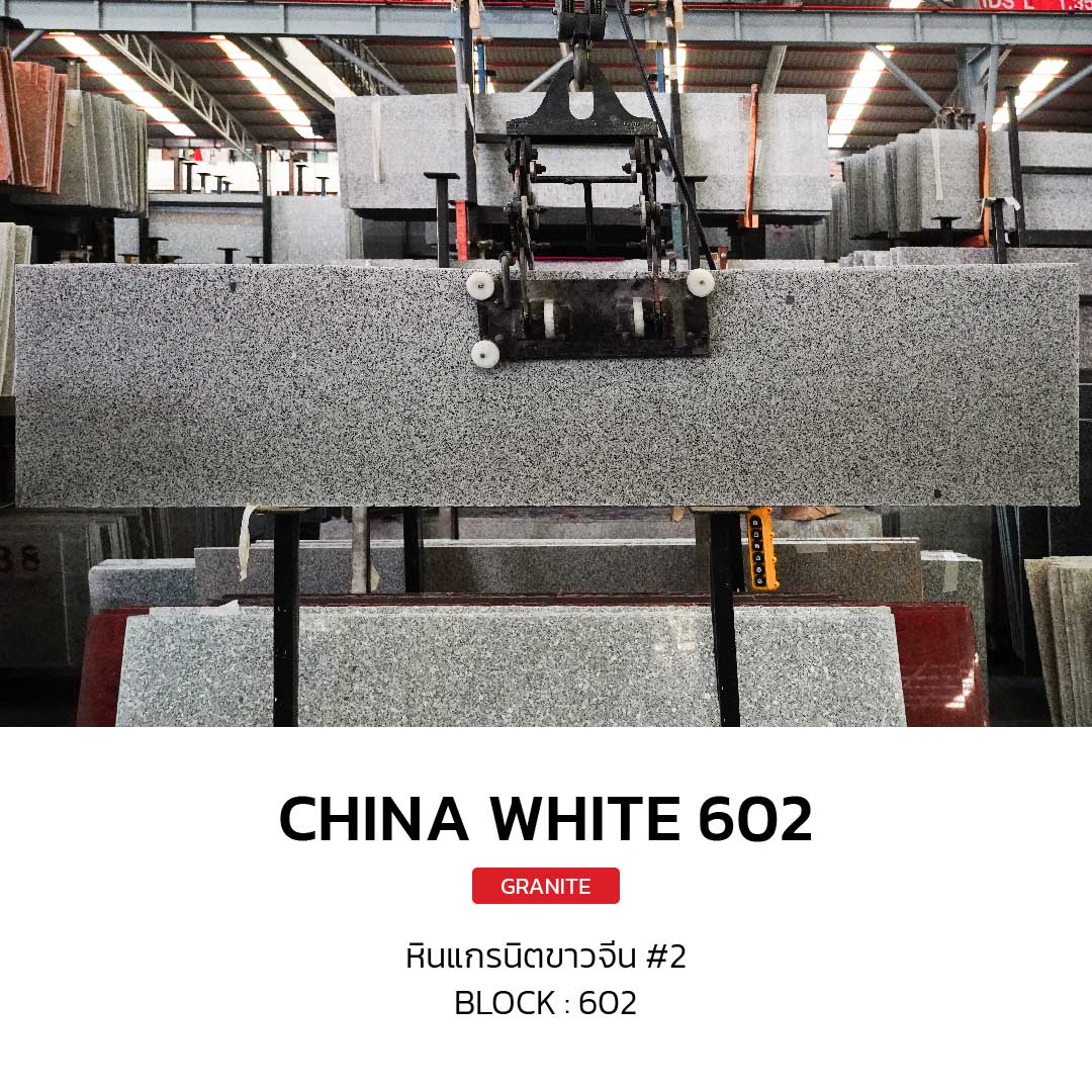 หินแกรนิต ขาวจีน 602#2 (China White Granite 602#2) หินธรรมชาติที่สะท้อนความเรียบง่ายและสะอาดตาได้อย่างไร้ที่ติ ด้วยพื้นผิวสีขาวสว่างหรือเทาอ่อนที่สม่ำเสมอทั่วทั้งแผ่น โดดเด่นด้วยการกระจายตัวของเม็ดแร่สีดำและสีเทาขนาดเล็กอย่างสม่ำเสมอ ทำให้เกิดลวดลายที่ดูละมุนตาและเป็นระเบียบ หินชนิดนี้เป็นที่นิยมอย่างมากในงานออกแบบที่เน้นความโมเดิร์นและมินิมอล เพราะให้ความรู้สึกโปร่งโล่งสบายตา และยังเป็นวัสดุที่แข็งแกร่งทนทานต่อการขีดข่วนและความร้อนสูง จึงเหมาะอย่างยิ่งสำหรับเคาน์เตอร์ครัวและพื้นที่ที่ต้องการความสวยงามควบคู่ไปกับฟังก์ชันการใช้งาน